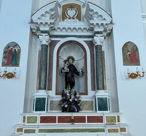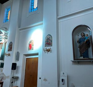 Sono presenti nella chiesa alcune statue tra cui, quella della Madonna del Rosario, risalente agli anni del Settecento, e quella del Sacro Cuore di Gesù, ma di misure più ridotte, oltre a un crocifisso in legno, posizionato sull’altare, sotto la nicchia nel quale vi è la Madonna del Rosario. All’esterno della chiesa, inoltre, vi è un fante in bronzo, risalente al 1989, per commemorare i caduti in guerra.