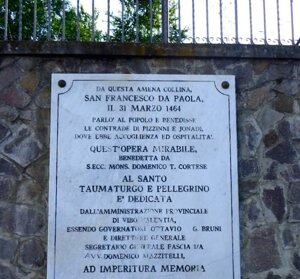 Gli elementi usati per i suoi miracoli erano davvero i più semplici e a portata di tutti gli uomini, quasi a far capire che non erano essi a far guarire, bensì Dio. Molti dei suoi miracoli impressionarono fortemente letterati e artisti che lo immortalarono nelle loro opere: come il noto passaggio dello Stretto di Messina compiuto sul mantello steso sulle onde del mare. Fu proprio durante il viaggio verso la Sicilia che Francesco fece visita al Paese di Jonadi, pernottando in un’umile casa al confine del paese, sita in via 24 maggio, dove tuttora vi è una targa che ricorda l’evento.